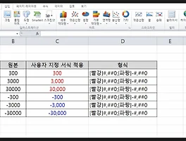 엑셀 사용자 지정서식에서 몇 가지 활용 가능한 항목들이 있는데, 그것들에 대해 소개해드리려 합니다. 숫자 조건에 따른 색상 표시하기 숫자 조건은 두 가지 조건을 기입할 수 있는데, 조건에 따라 셀 서식을 별도로 적용할 수 있고, 글자 색상까지도 별도로 적용할 수 있습니다. 사용 가능한 색상 코드 : [검정], [파랑], [녹청], [자홍], [빨강], [흰색], [노랑] 입니다. 6년 전 컴퓨터 활용능력 1급을 준비하면서 기록했던 사항이라, 지금은 변경됬을 수도 있을 것 같습니다. 변경 사항이 있으면 알려주시면 감사드립니다. 예시 : [빨강][>3000]#,##0;[파랑][3000]#,##0 은 셀에 기입된 수가 3000을 초과할 경우, 셀 서식 #,##0을 적용하며, 글자 색상은 빨강색으로 표시합니다...